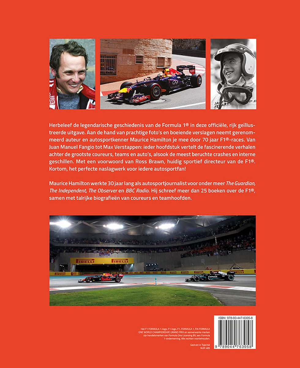 Dankzij Max Verstappen is de Formule 1-gekte niet meer weg te slaan uit Nederland en België. Herbeleef de legendarische geschiedenis van de Formule 1 in deze officiële, rijk geïllustreerde uitgave. Van Juan Manuel Fangio tot Max Verstappen: leer dankzij de spectaculaire foto’s en boeiende verslagen meer over de grootste coureurs, teams en auto’s, alsook de meest beruchte crashes en interne geschillen. Met een voorwoord van Ross Brawn, huidig sportief directeur van de F1. Het perfecte cadeau voor iedere autosportfan! Maurice Hamilton werkte 30 jaar lang als autosportjournalist voor onder meer The Guardian, The Independent, The Observer en BBC Radio. Hij schreef meer dan 25 boeken over de F1, samen met talrijke biografieën van coureurs en teamhoofden.